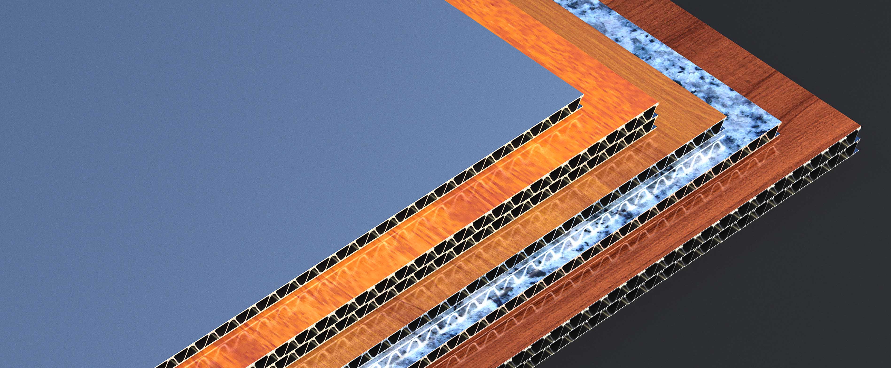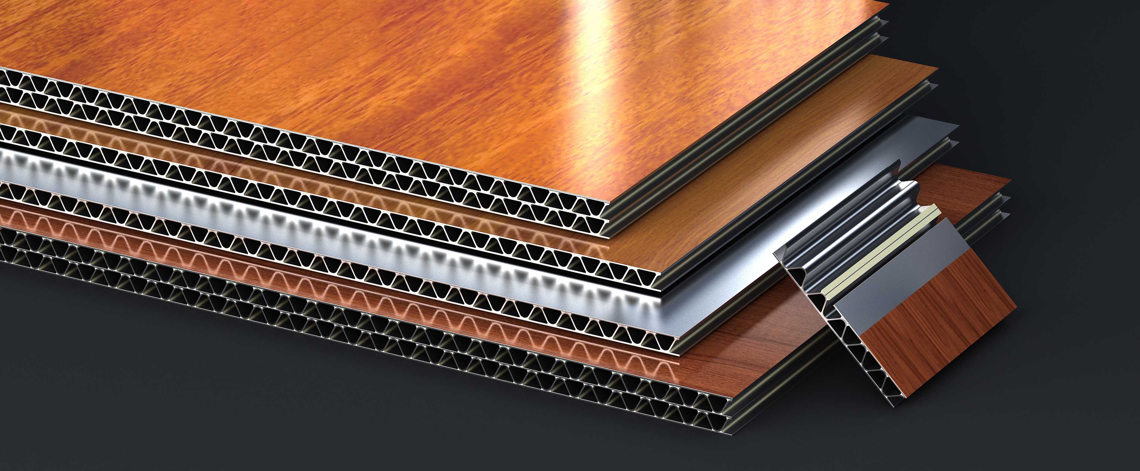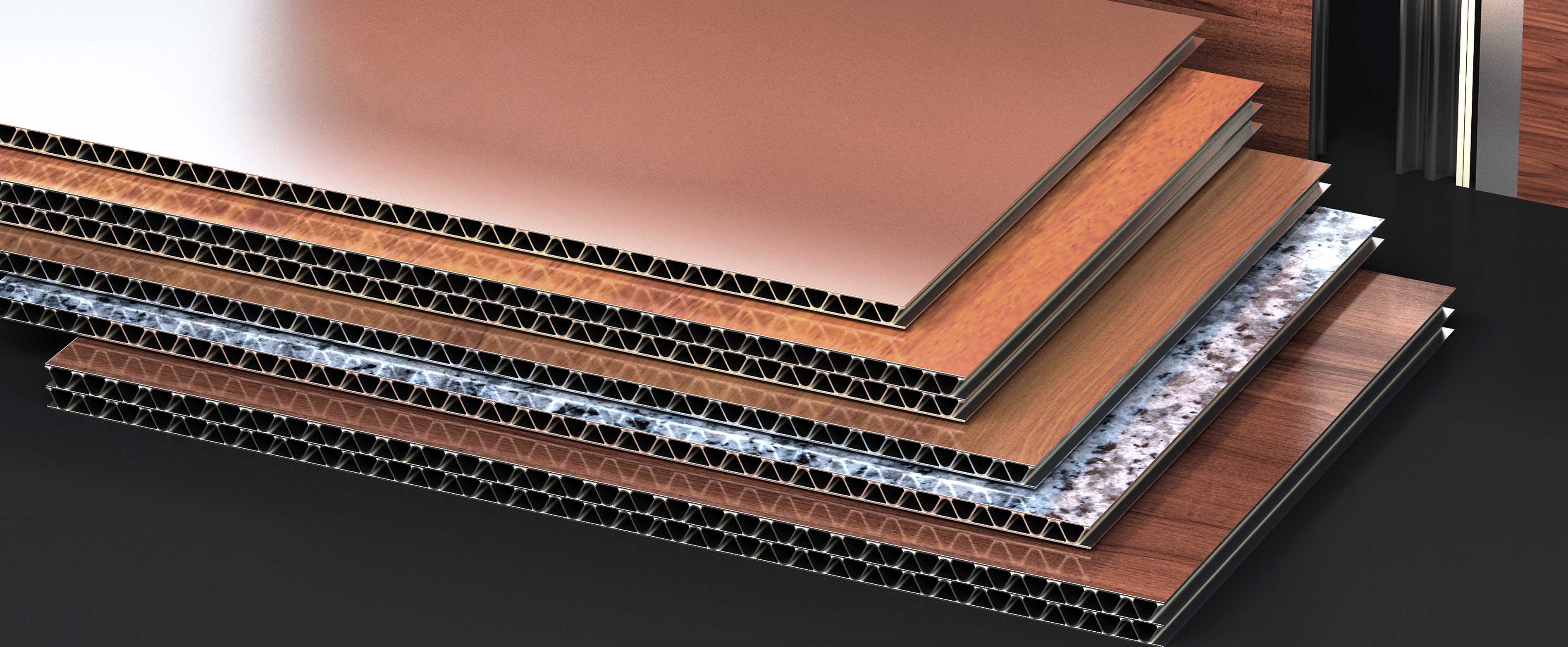 鋁波紋芯復合鋁板也稱為鋁質瓦楞復合板 , 我們采用氟碳輥涂處理面板、波紋芯雙面輥涂雙組份環氧樹脂膠、與表面處理后的背板組成我們的鋁波紋芯復合鋁板。在全自動生產線冷壓水波紋型 , 利用熱固化雙組份結構樹脂粘結劑與面板背板粘結面為弧型 , 增大金屬板卓越的粘合力 , 確保粘結性能穩定牢固與建筑同壽命的耐久性。